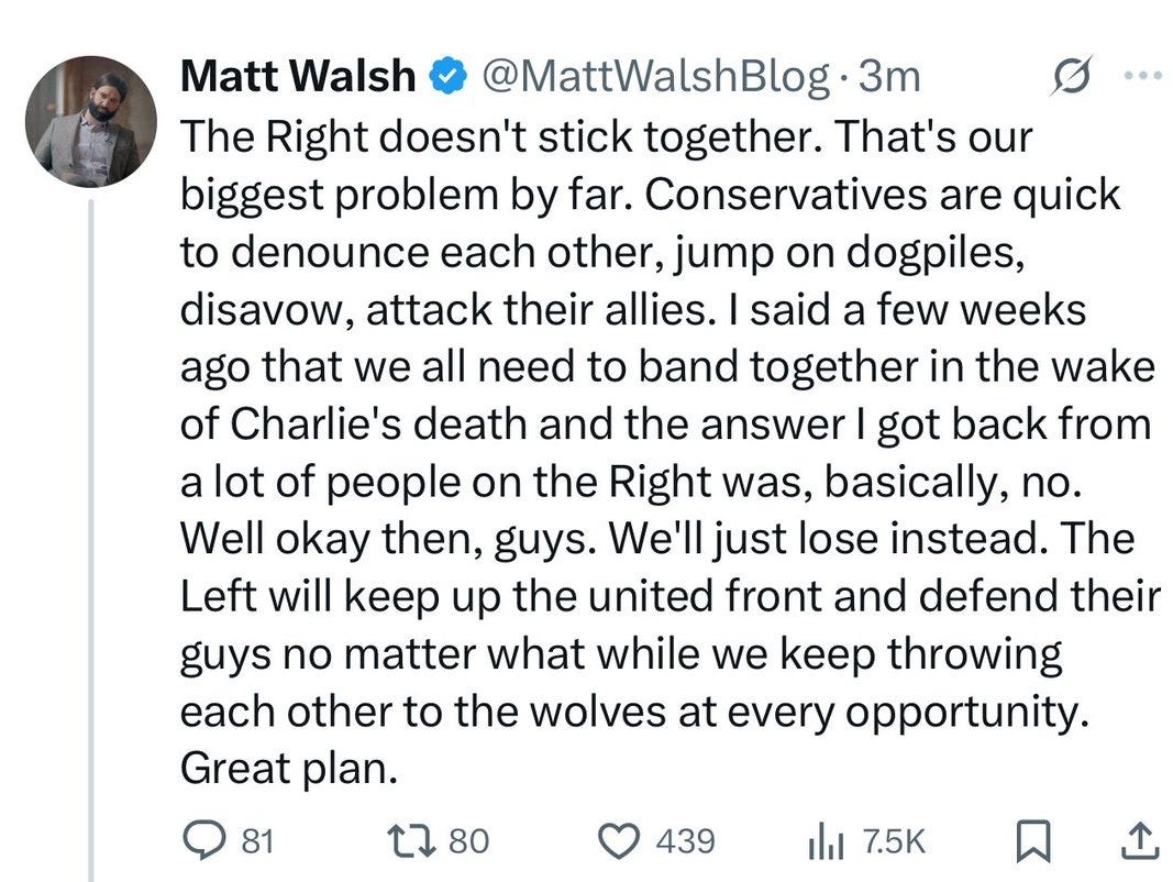 So, unity with nutjobs is not a win. Still, Matt Walsh insists that we shouldn’t focus on calling out bad actors on the right and instead focus on the enemy, the left. But even if you were to embrace that idea uncritically, you still have to answer this question: