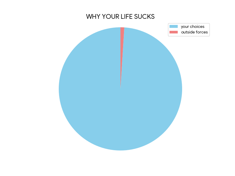 Your life is because of your choices. If things suck now, you don’t have to wait for huge changes to society or government — you can just make different choices. Starting today. If things suck, it’s because of you. Embrace the empowerment of knowing you’re the problem, because you control you.